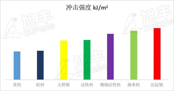 針對(duì)無機(jī)材料的應(yīng)用特點(diǎn),將重質(zhì)碳酸鈣、活性碳酸鈣、微細(xì)活性碳酸鈣、輕質(zhì)碳酸鈣、納米碳酸鈣、天然硫酸鋇和沉淀硫酸按20%的比例填充到ABS中,考察其對(duì)ABS沖擊強(qiáng)度的影響,具體如下圖: