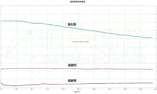 為更加清楚地闡述粉體對(duì)流體流變特性影響,如下為流變儀展現(xiàn)的,不同種類粉體的膠粘劑流變特性。以下為800目滑石粉、碳酸鈣、硫酸鋇流變特性對(duì)比情況: